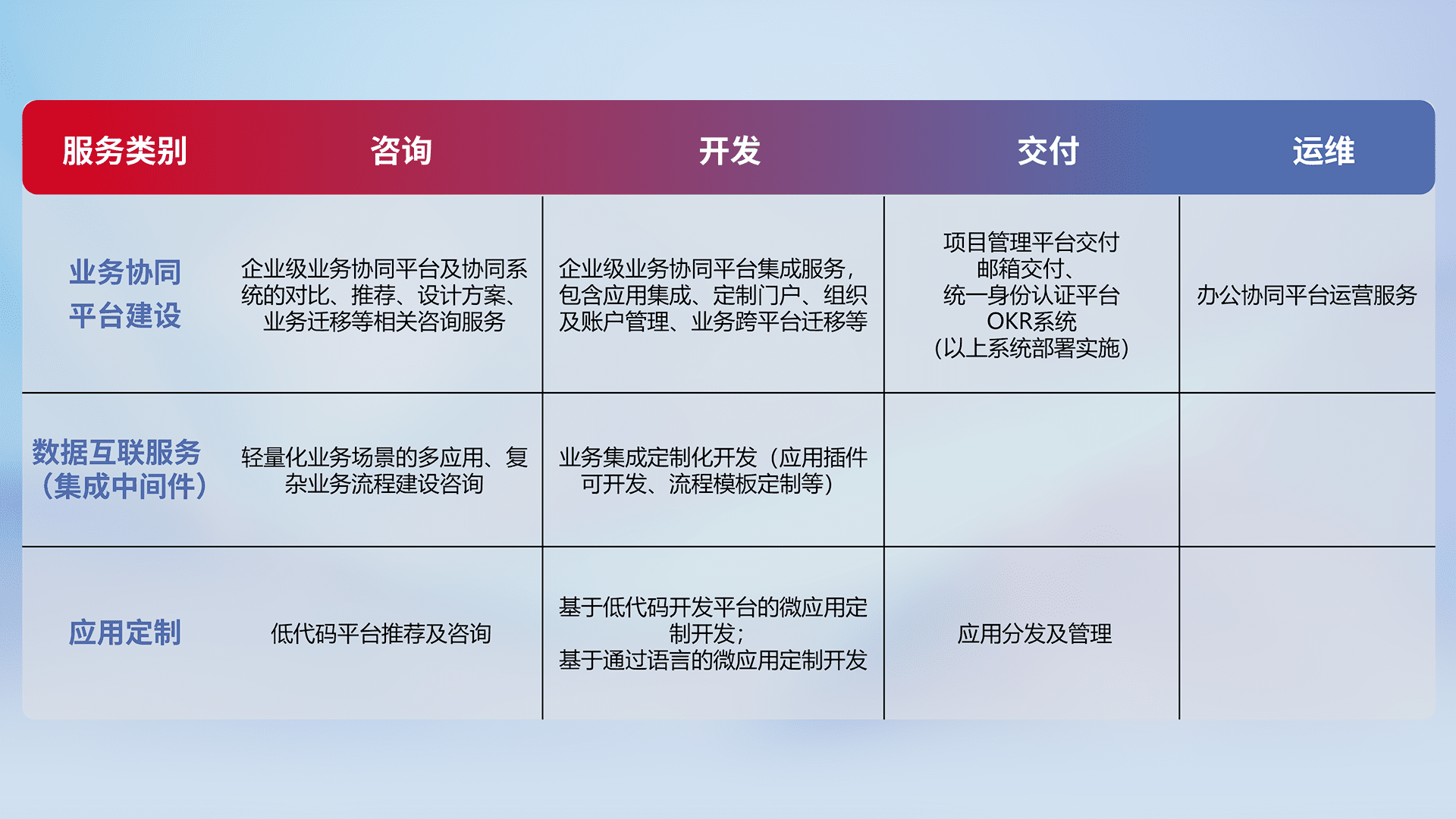 针对钉钉、、、、企微、、IDaas等平台级产品提供产品的规划、、方案、、、交付、、定制化开发等服务,,实现如统一协同办公、、、、智能客户服务、、混合会议管理、、、智能数据查询、、、、等业务场景,,,实现数字化转型。。。